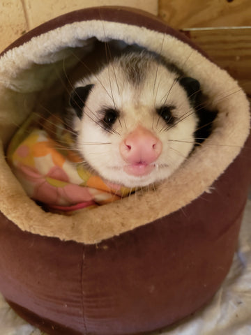 So…he was separated from his siblings, brought back into my rehab area and was on pain medication and antibiotics for two weeks. During that time he became quite accustomed to being a “house possum” and decided that Awesome ‘Possumz was where he wanted to stay. He bonded to me and would routinely hold on tight to my hair and “slub” me nearly to death.