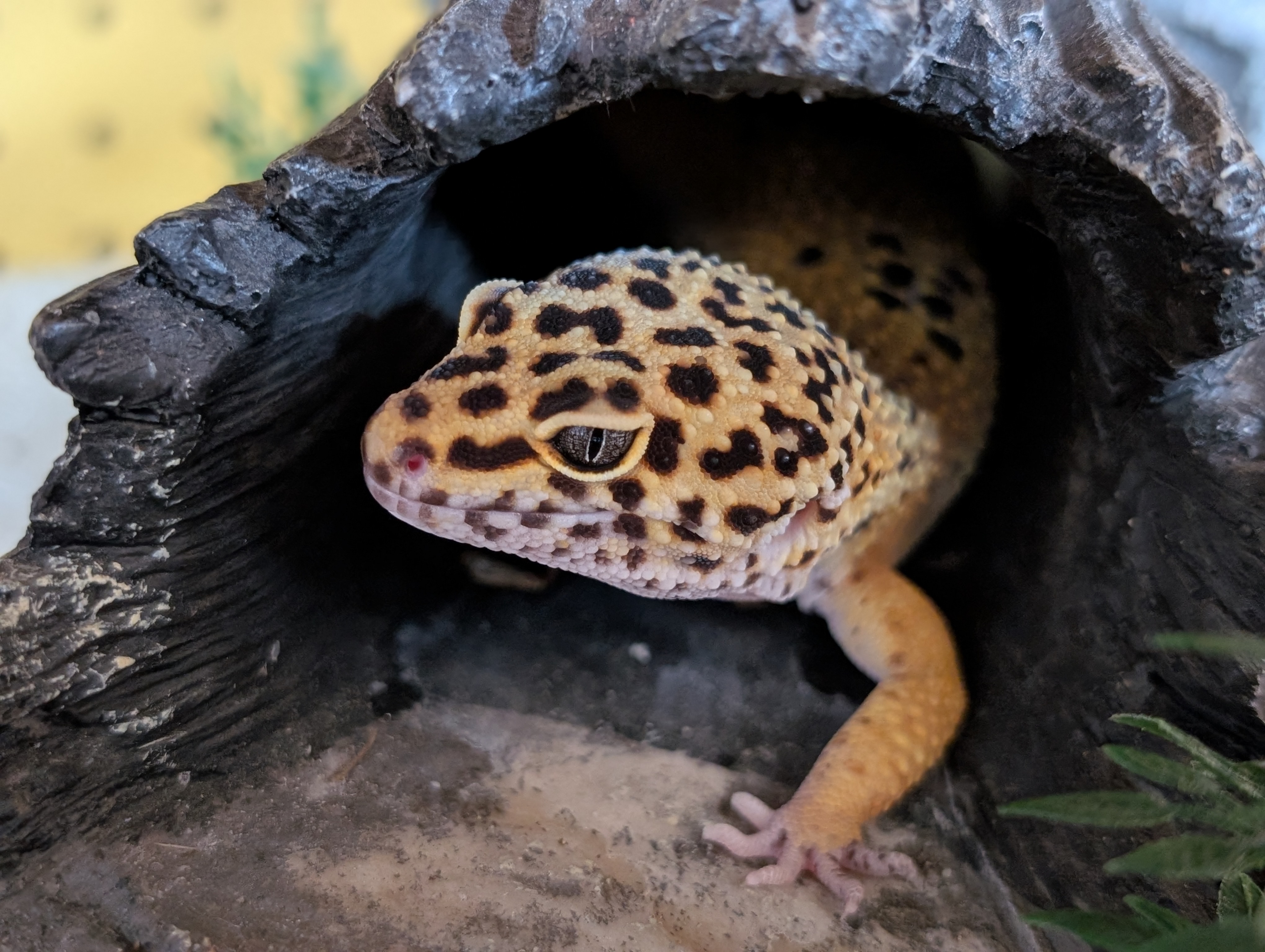 Sunny is a rescue leopard gecko. Named for their spots, leopard geckos are sometimes referred to as the first domesticated lizard. Unlike other geckos, the leopard gecko does not have lamellae, which is what makes geckos able to climb smooth surfaces. They are carnivores and primarily eat insects.