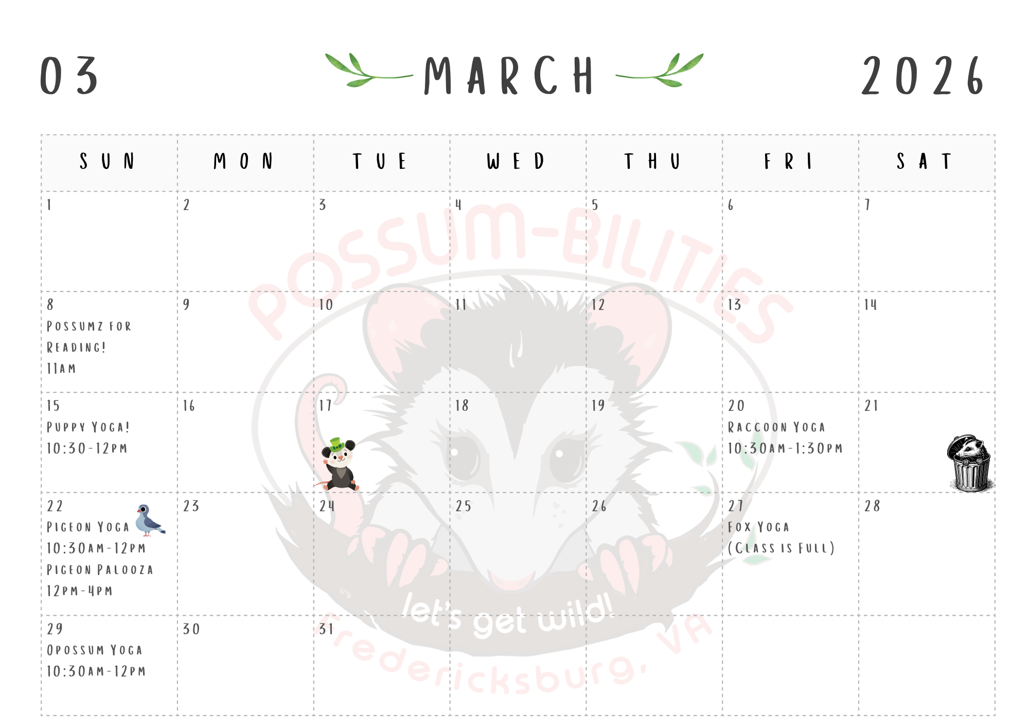 Join us for a morning of storytelling and creativity! We will start with a cozy story time, followed by a hands-on craft activity. But the best part??? We will have a very special, furry guest joining us- a real-life opossum! Come learn why these misunderstood marsupials are actually backyard superheroes!