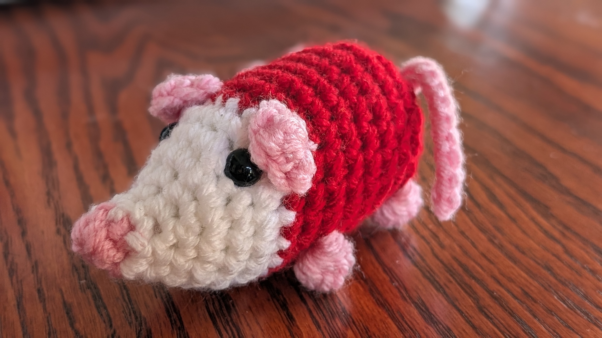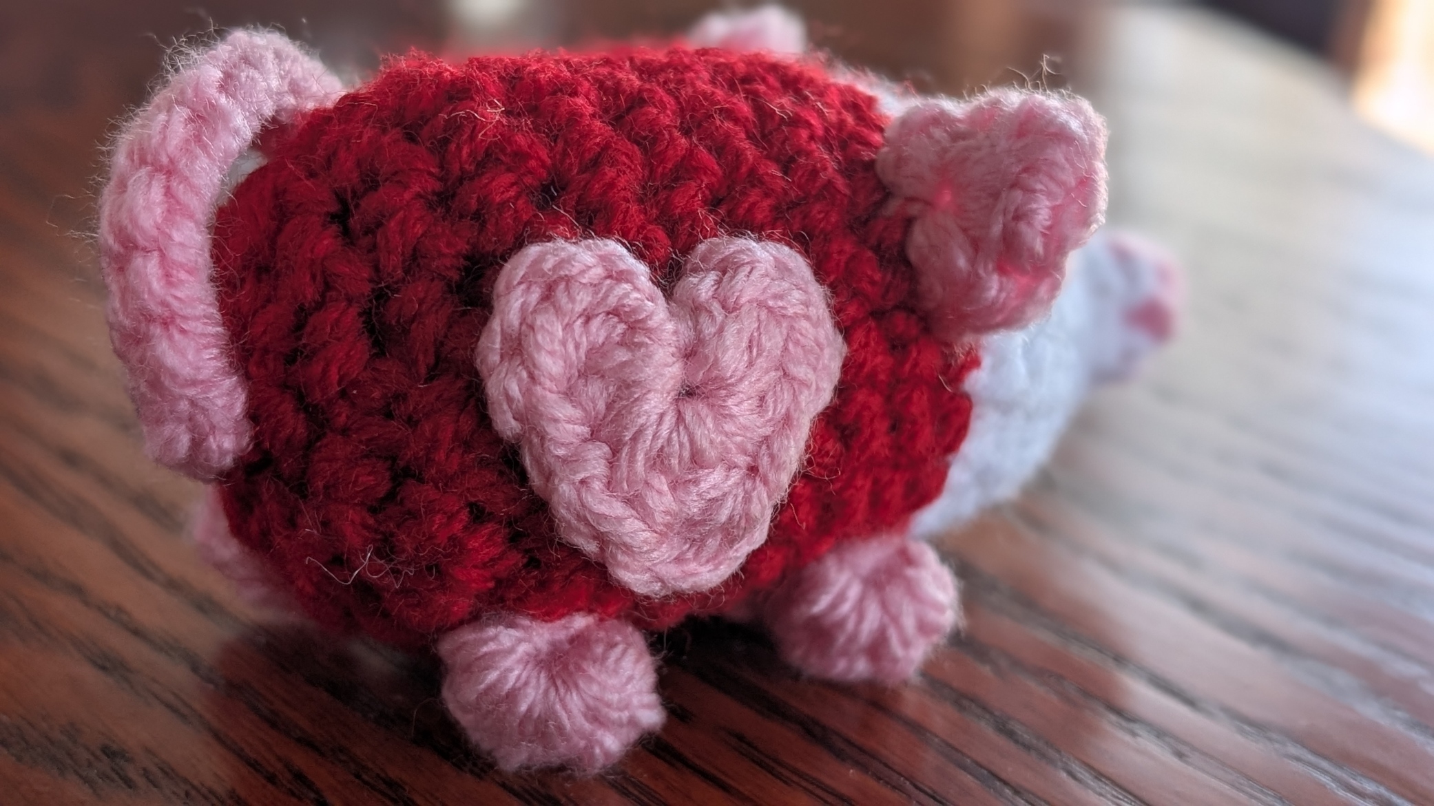 - Made with red, white, and pink yarn
