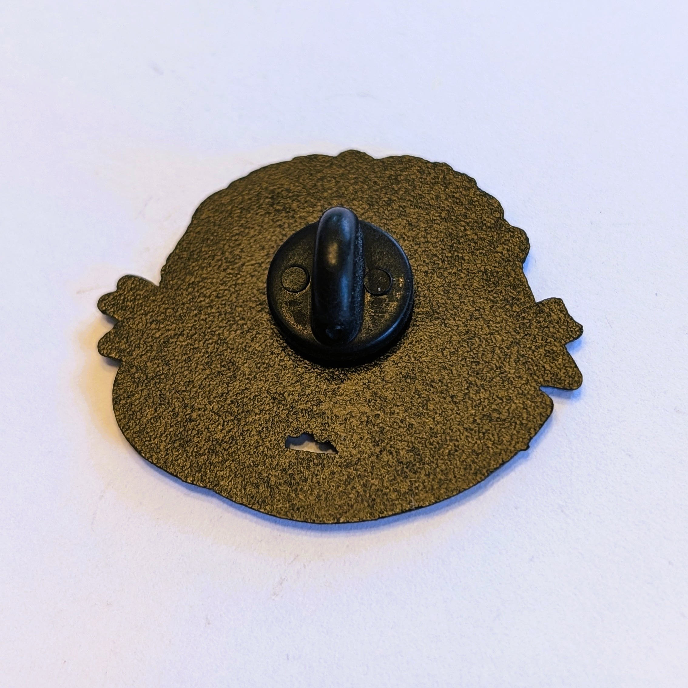- Black matte metal finish with gray, pink, and mauve enamel.