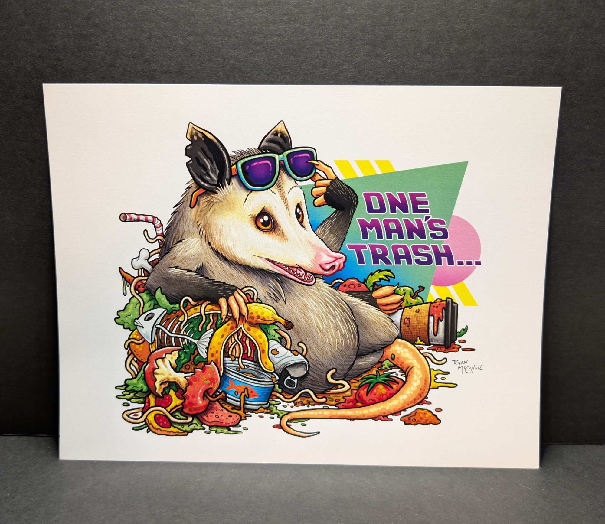 One man’s trash is for sure another’s treasure, never truer than for the scavenger tendencies of opossums. This print captures that life advice. We are excited to share these amazing prints from a favorite fellow opossum lover, Ryan McCulloch! Each 8.5″x11″ print is individually signed. They are printed on a sturdy 110lb Matte paper (Recycled). These prints are sure to wow in a simple frame, but will also fit perfectly behind an 8″x10″ mat opening if you prefer.