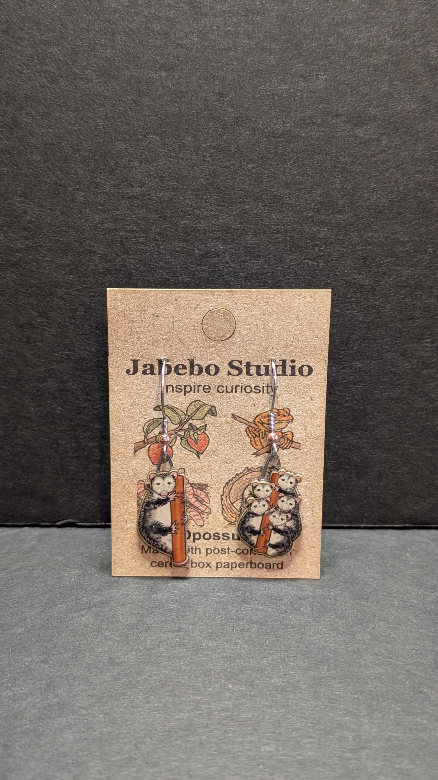 Looking for the perfect balance of fashion and recycling consciousness in your earrings? Look no further! These amazing opossum creations come from the wonderful people of Jabebo Studio. Each set is created with post-consumer cereal boxes. The set features a momma for one side and a cluster of her babies on the other.