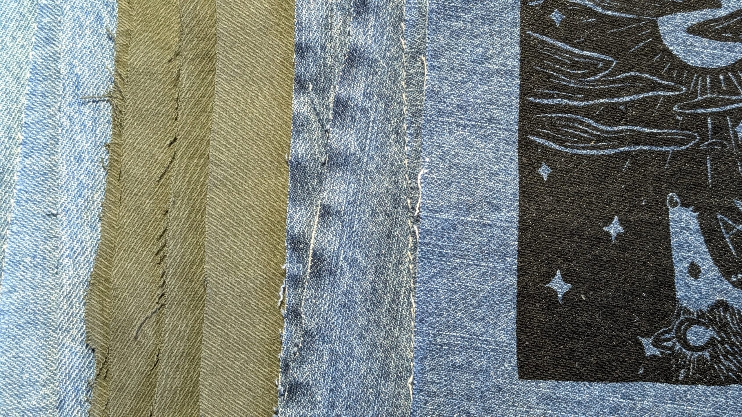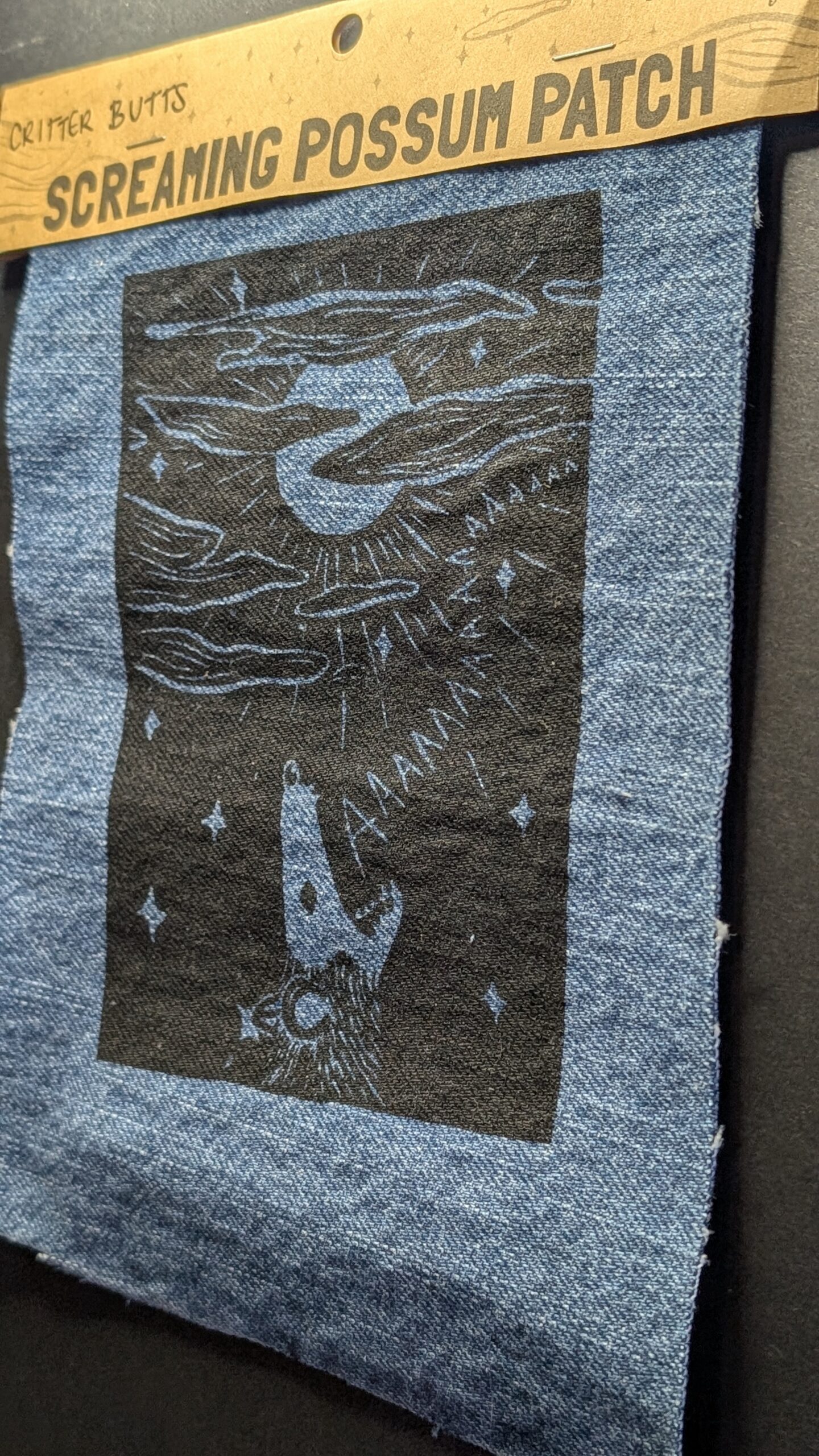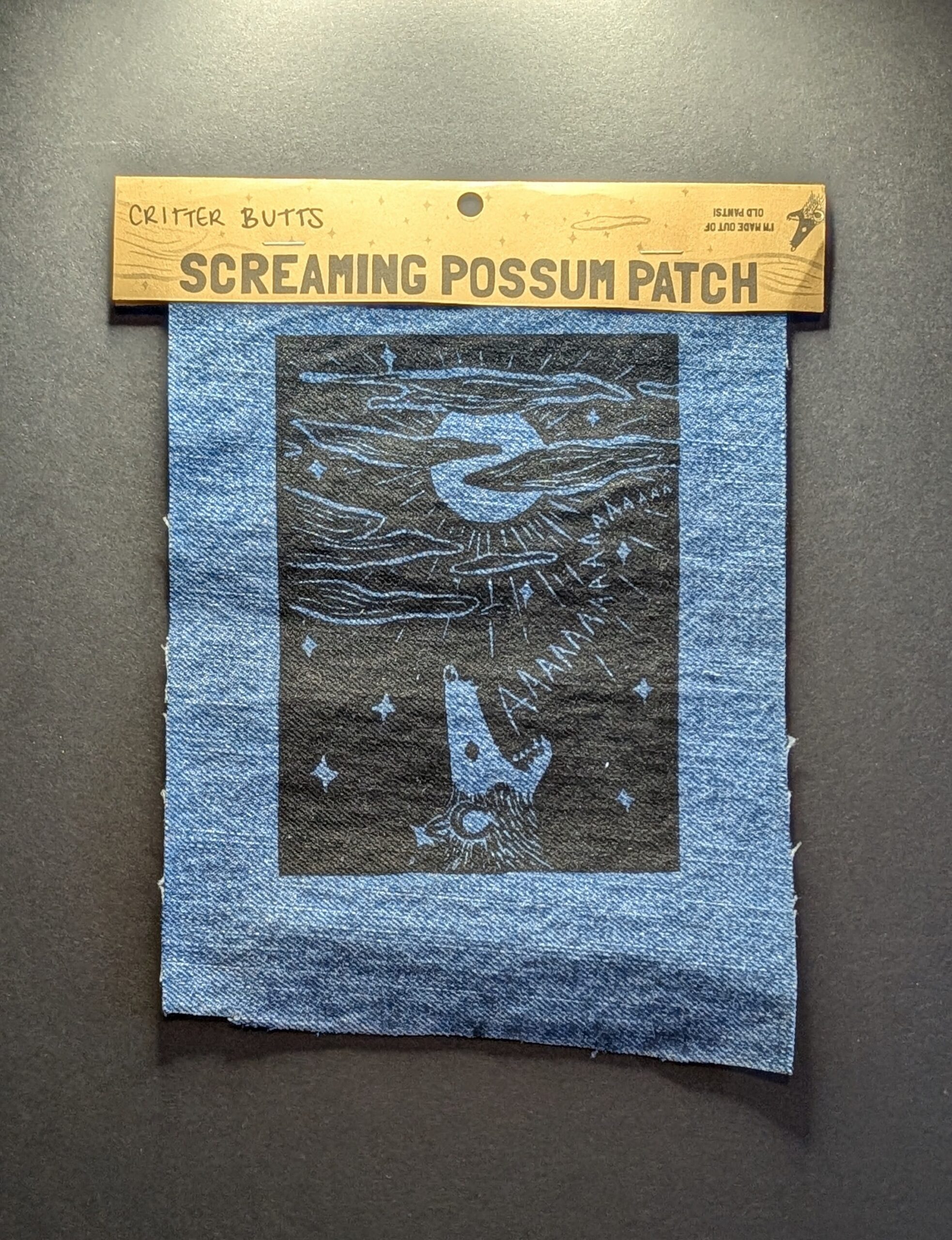 These patches (based on a Critter Butts original linocut) are screen printed by Joan & Dylan in their home studio with water-based ink on thrifted 97%+ cotton denim/pants material. Fabric content will vary from 97-100% cotton, with occasionally 1-3% being elastane/spandex/etc. Some patches will be thicker weave denim, while others may be finer weave, as in khaki pants.